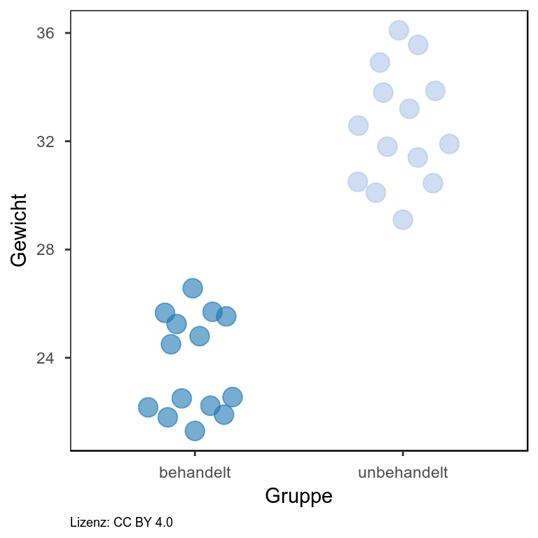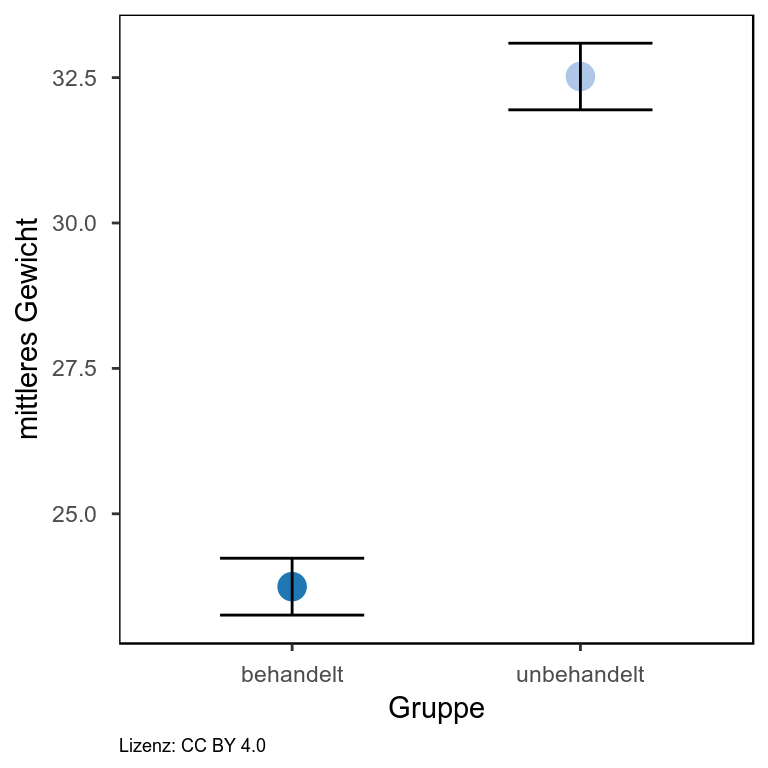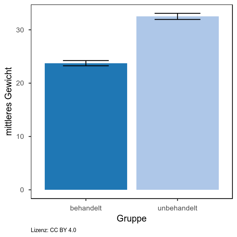 Gezeigt ist hier das Gewicht von zwei Gruppen von Tieren, Behandelte und unbehandelte Tiere. Wie man erkennen kann, wiegen die behandelten Tiere im Schnitt weniger als die Unbehandelten. Als Streuungsmaß ist hier der Standardfehler angegeben. Da dieser zwischen beiden Gruppen nicht überlappt, kann man davon ausgehen, dass der Unterschied im Gewicht beider Gruppen auch signifikant ist. Um dies zu belegen, würde man allerdings noch einen statistischen Test durchführen.