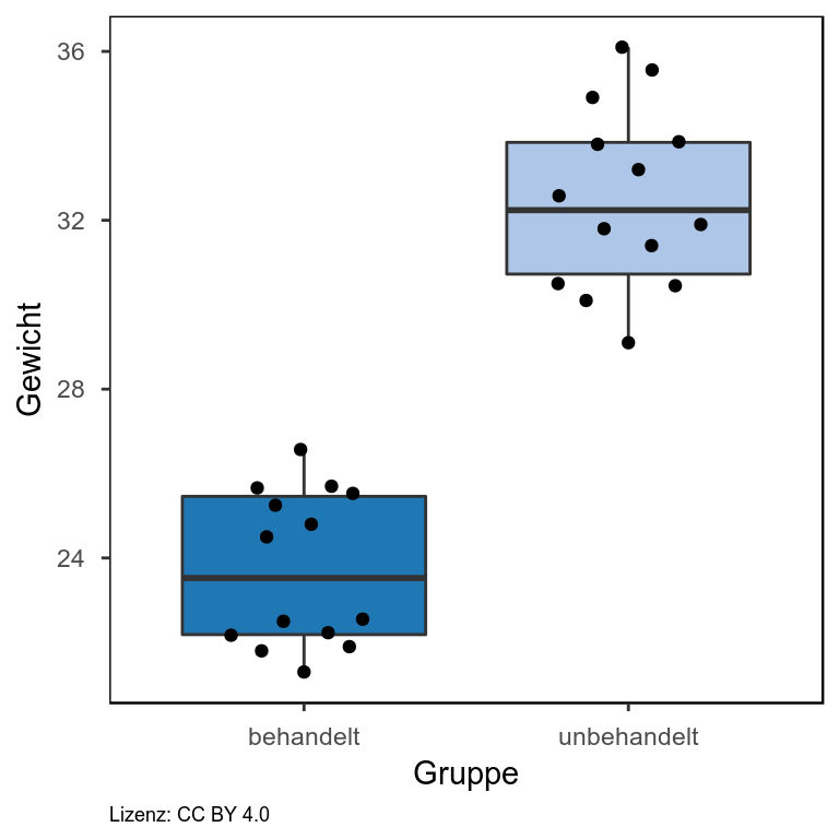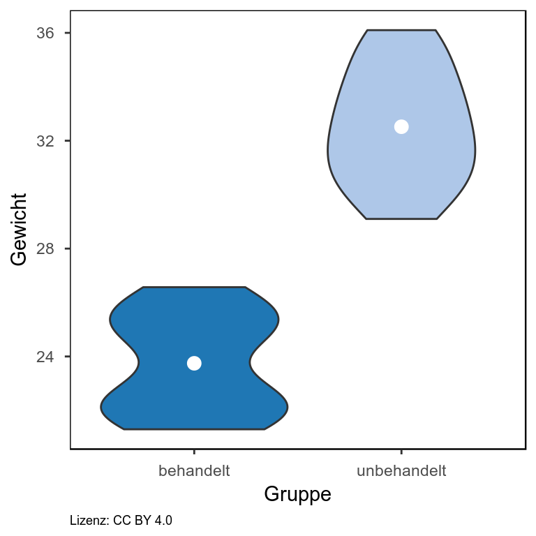 Man kann in diesem Violinplot erkennen, dass das Gewicht der unbehandelten Tiere ziemlich uniform um den Mittelwert (weißer Punkt) verteilt ist. Bei den behandelten Tiere sieht man zwei Bäuche in der Verteilung, d.h. es gibt eine Häufung von Daten einmal im oberen und einmal im unteren Wertebereich.