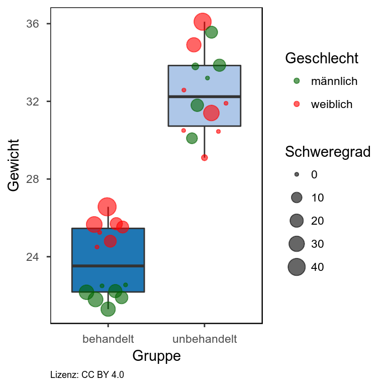 An diesem Beispiel sieht man, dass der Schweregrad sich kaum zwischen behandelt und unbehandelten Tieren unterscheidet. Auch wenn man sich nur die Behandelten betrachtet erklärt der Schweregrad nicht die beiden Gewichtsgruppen, wohl aber das Geschlecht. Zur Absicherung dieser Aussagen würde man natürlich die passenden statistischen Tests durchführen. Das soll aber hier nicht Thema sein.