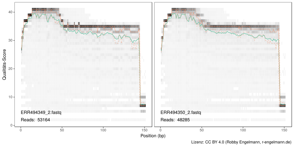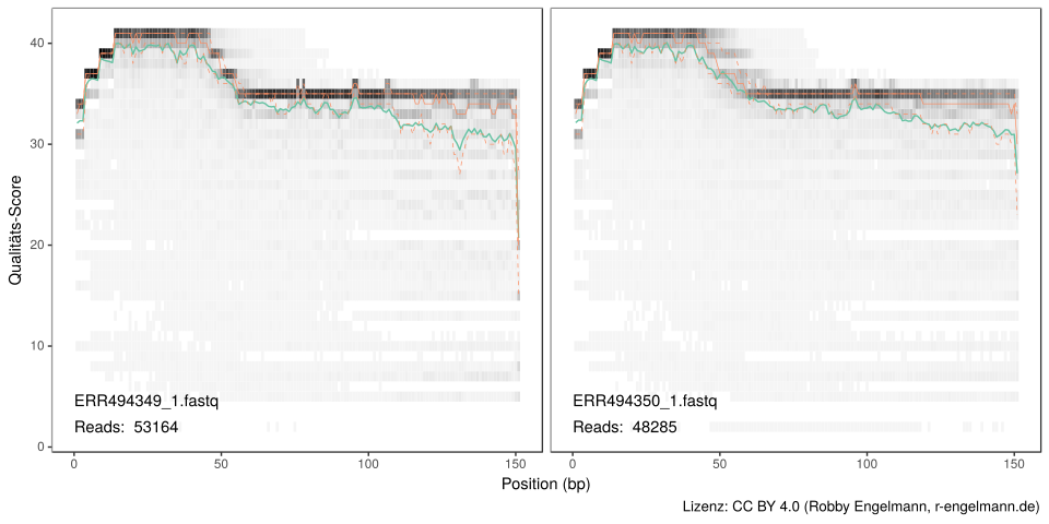 Aufgrund der Sequenziertechnik besitzen nicht alle Sequenzen bzw. alle Sequenzbereiche eine hohe Qualität. Daher müssen die Reads zunächst entsprechend eingekürzt werden. Außerdem müssen Sequenzen geringer Qualität entfernt werden. Dazu besitzen die fastq-Dateien, die die Rohdaten enthalten, Informationen zur Fehlerwahrscheinlichkeit bzw. Qualität für jede Basenposition jedes Reads.