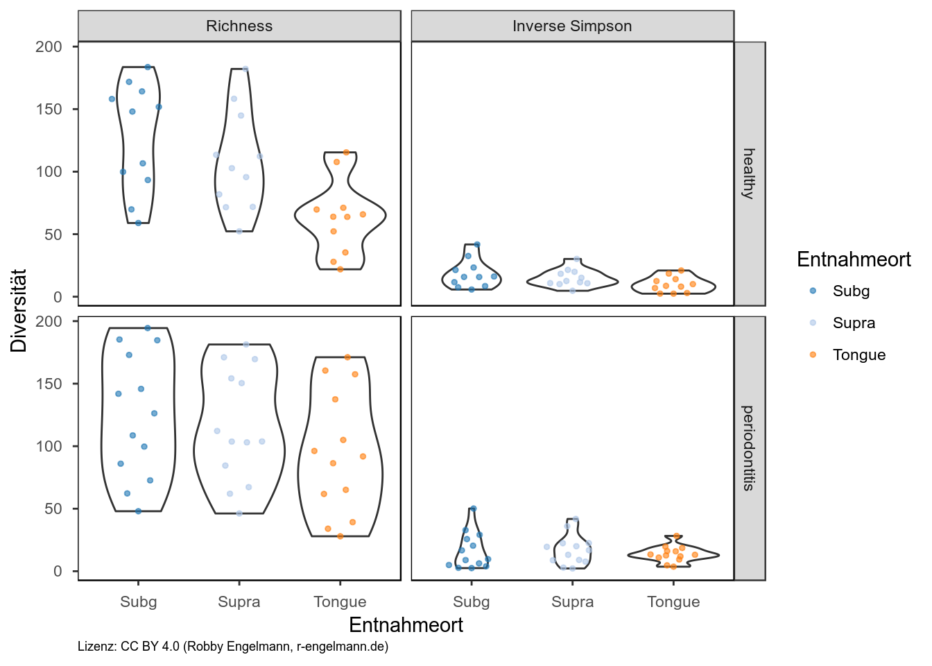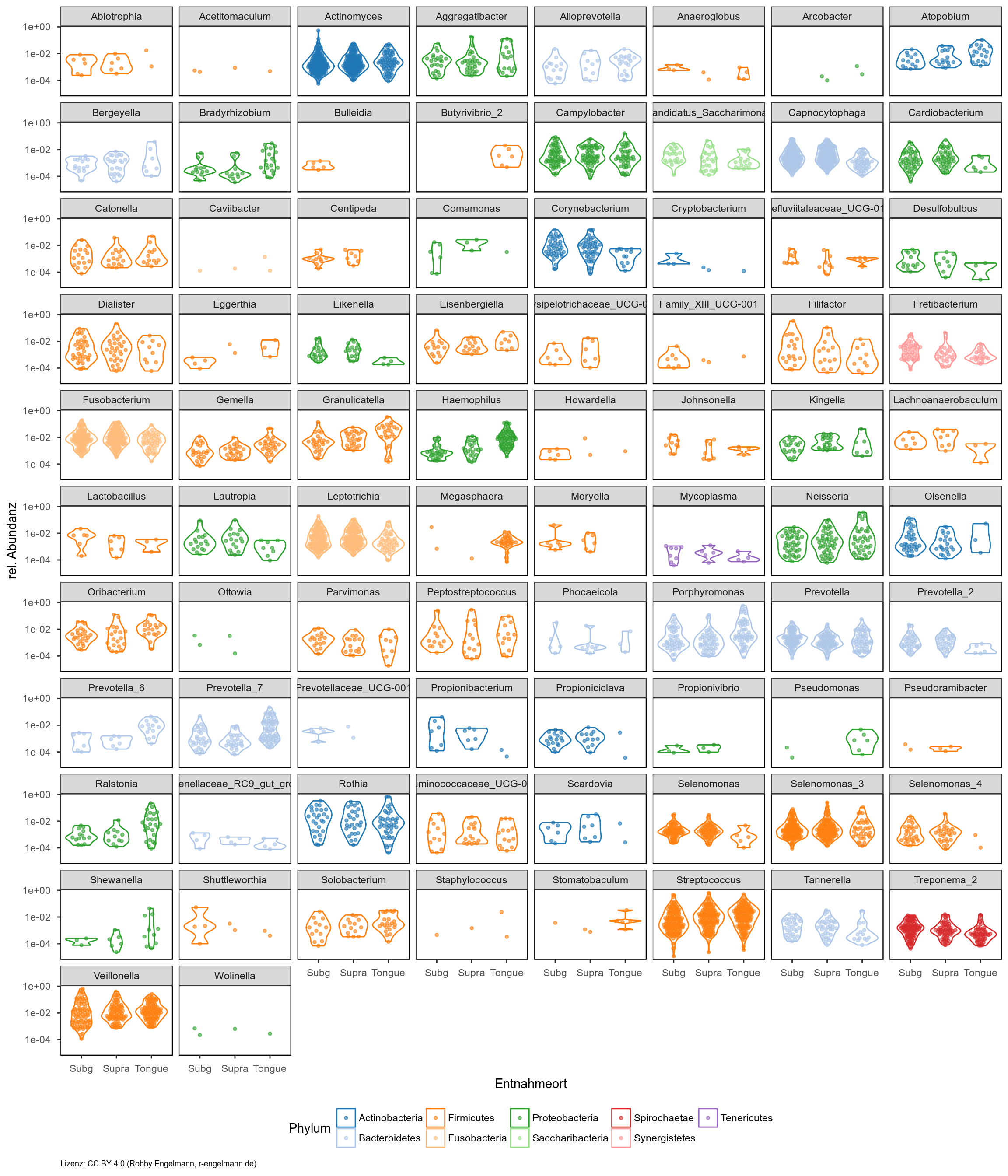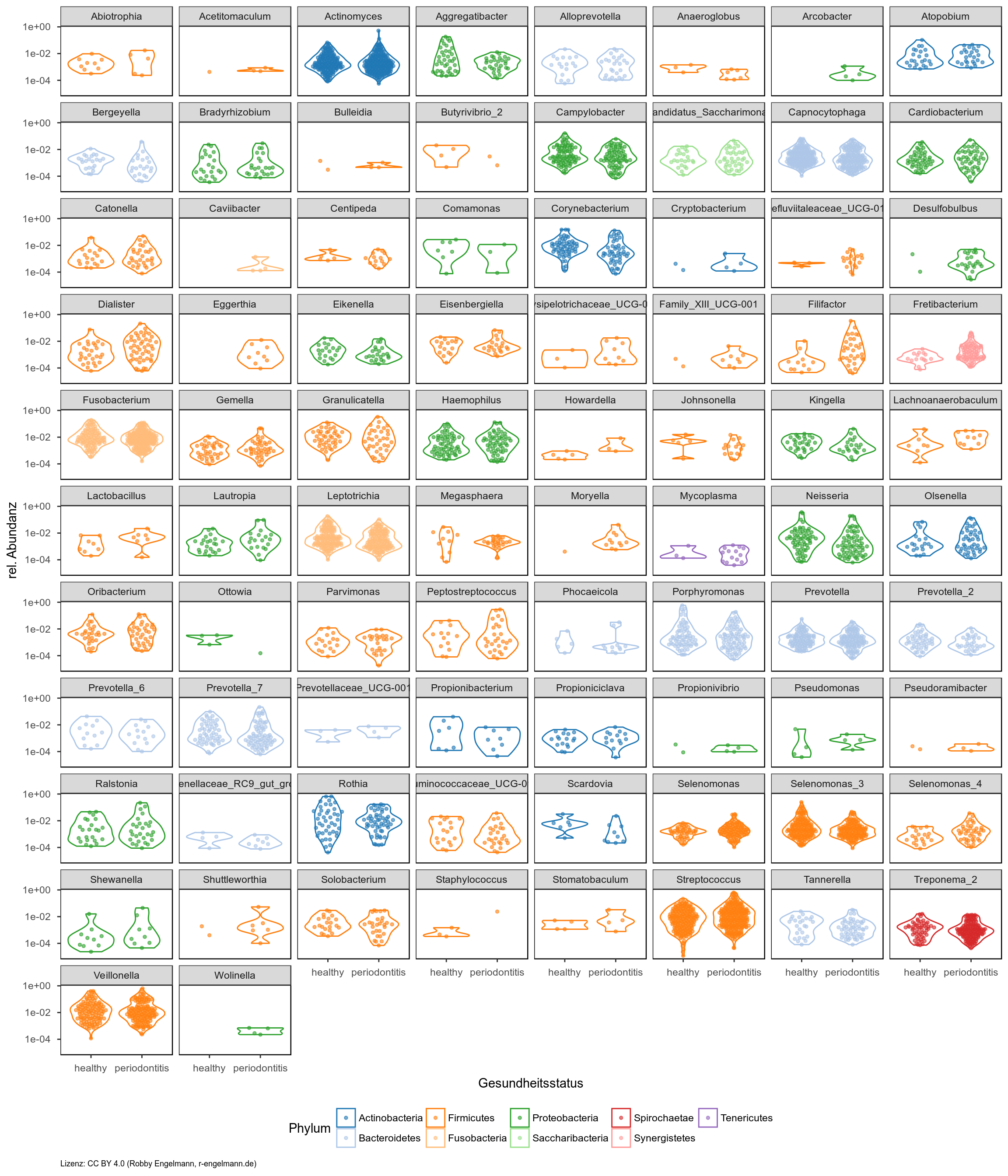 Die folgenden Grafiken bieten einen schnellen Überblick über die Unterschiede zwischen verschiedenen Gruppen. Man sieht für alle zugeordneten Gattungen die relativen Abundanzen vergleichend für Entnahmeorte (erste Grafik) bzw. den Gesundheitsstatus (gesund versus Parodontitis in der zweiten Grafik) auf der y-Achse. Die Anzahl der Punkte gibt außerdem die Unterschiede in der Prävalenz wieder.