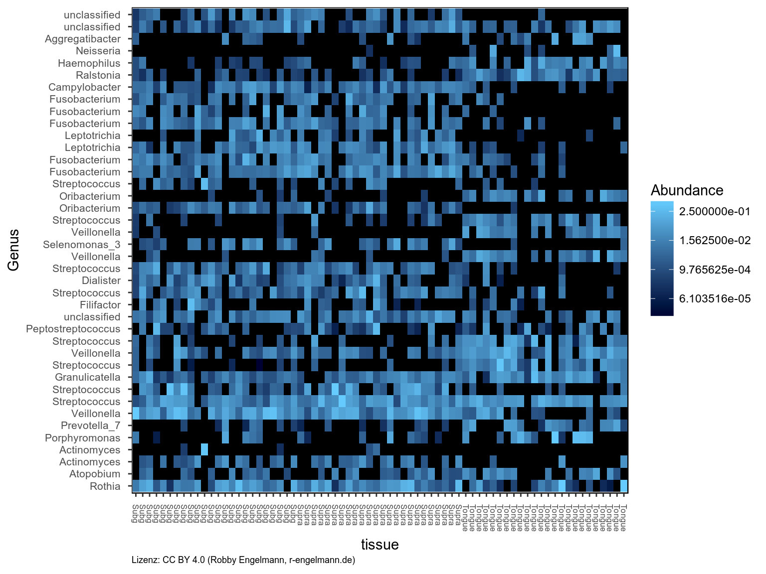 Als nächstes wurden die 40 ASVs mit der höchsten relativen Abundanz gefiltert und die Heatmap als Darstellungsform gewählt. Hier kann man Taxa ablesen, die kaum auf der Zunge wohl aber in den Zahnbelägen vertreten sind (dunkler Bereich rechts oben). Außerdem kann man Taxa erkennen, die kaum in den Zahnbelägen, wohl aber auf der Zunge zu finden sind (dunkler Bereich links in der Mitte).