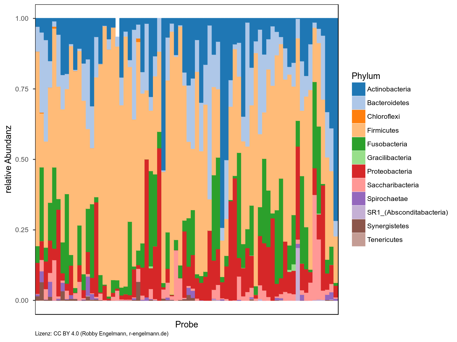 Die Abundanz lässt sich mit verschiedenen Darstellungsformen visualisieren. Als erstes Beispiel habe ich hier das gestapelte Balkendiagramm (engl.: stacked-bars) gewählt. Die erste Version zeigt jede Probe der Studie einzeln. In der zweiten Abbildung wurden alle Proben eines Entnahmeortes gemittelt dargestellt. In den Abbildungen bedeuten Tongue = Zunge, Subg = subgingival (Beläge auf dem Zahn unterhalb des Zahnfleischrandes aus der Zahntasche) und Supra = supragingival (Beläge auf dem Zahn über dem Zahnfleischrand). Die einzelnen Elemente des Balkenstapels spiegeln die jeweiligen Abteilungen (Phylum) wieder. Man könnte hier natürlich auch eine andere taxonomische Stufe wählen oder sich z.B. auf die Gattungen einer Abteilung beschränken.