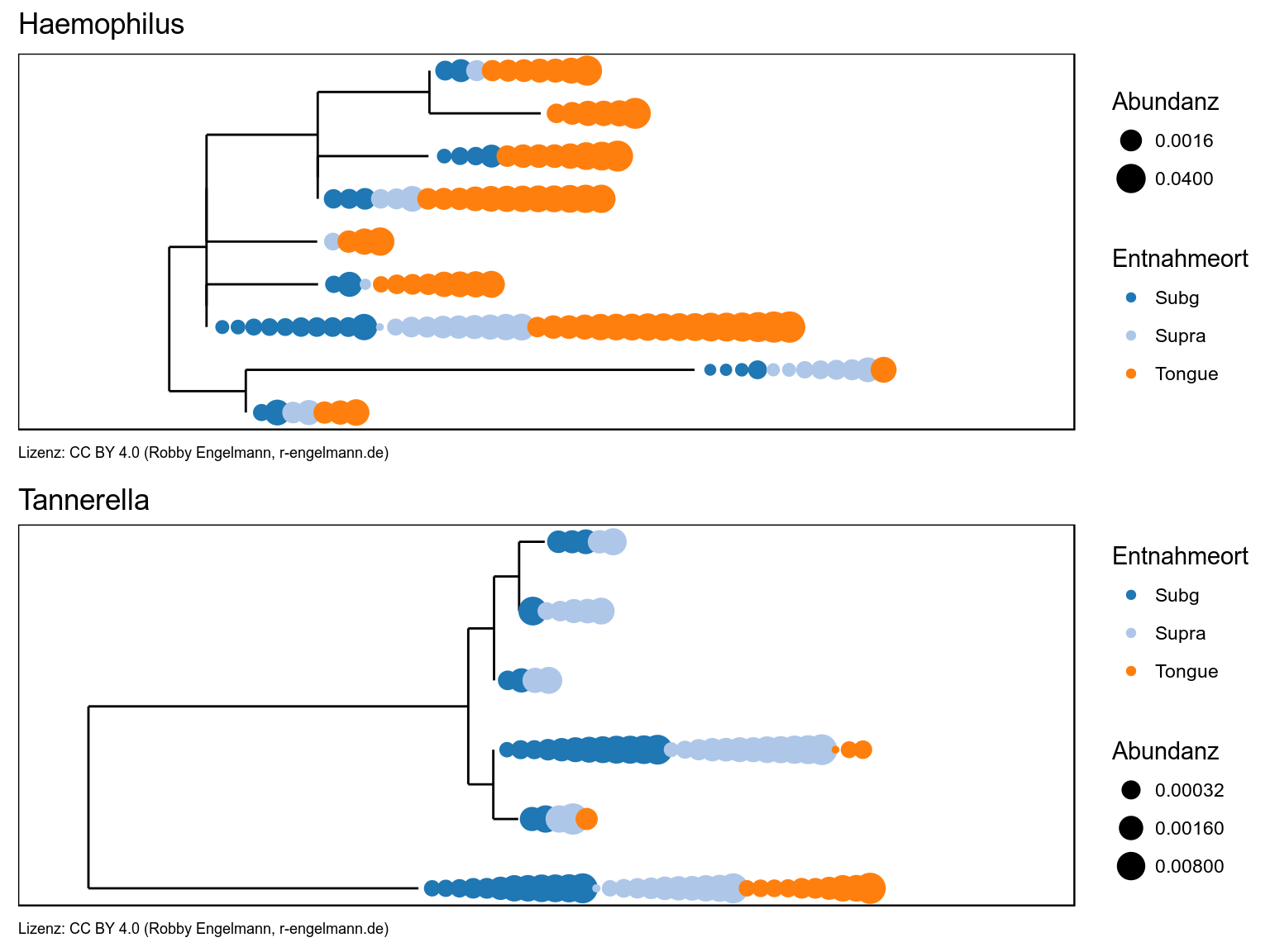 Dargestellt ist der Abstammungsbaum der ASVs aus den Gattungen Haemophilus und Tannerella. An den Spitzen des Baumes (den Blättern) ist je Probe ein Punkt dargestellt, wobei die Größe des Punktes die Abundanz wiedergibt und die Farbe beschreibt aus welcher Entnahmestelle die Probe entstammte.