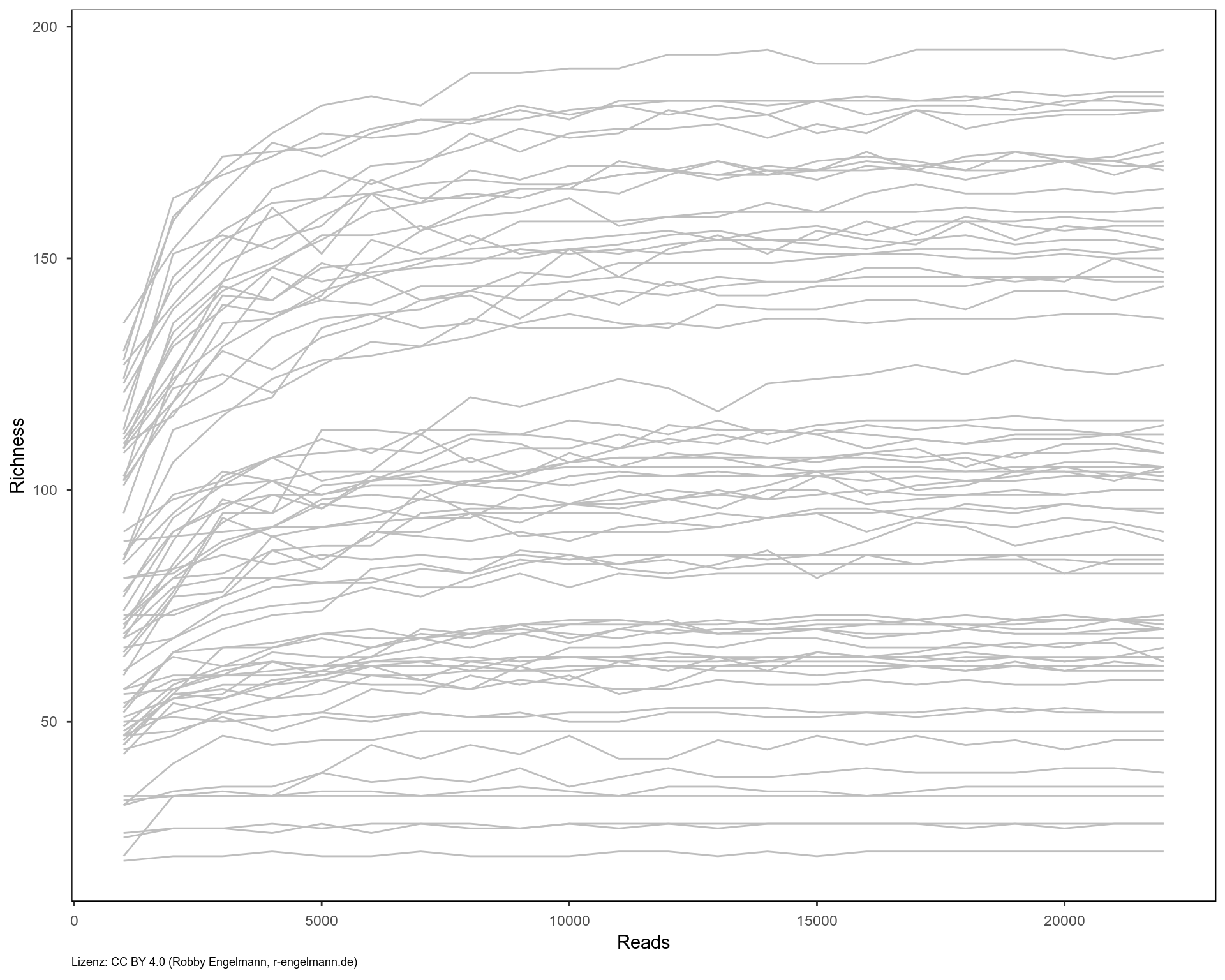 Wichtig dabei ist es zu überprüfen, ob die verwendete Anzahl an Reads ausreicht, um sich dem tatsächlichen Wert für die alpha-Diversität anzunähern, oder ob man die Diversität unterschätzt, weil zu wenige Reads gemessen wurden. Dies kann man prüfen, indem man eine steigende Anzahl an Reads aus den Proben zieht und das jeweilige Diversitätsmaß bestimmt. Die Diversität sollte sich mit steigender Readzahl der tatsächlichen Diversität annähern. Steigt die Kurve bei der gemessenen Readzahl noch immer an, so unterschätzt man die Diversität, weil keine ausreichende Menge an Daten vorliegt.