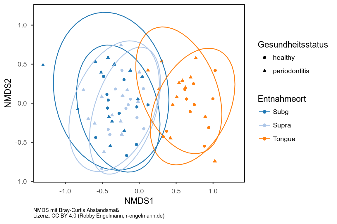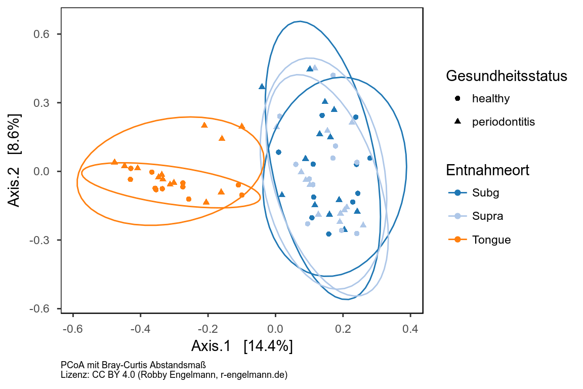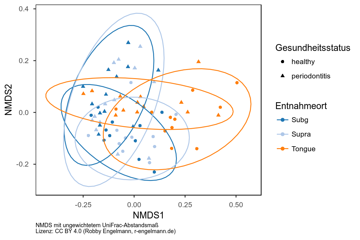 Zur Untersuchung der beta-Diversität werden standardmäßig verschiedene Methoden der Dimensionsreduktion (Principal Coordination Analysis [PCoA], Nonmetric multidimensional scaling [NMDS], u.a.) kombiniert mit unterschiedlichen Abstands- bzw. Unähnlichkeitsmaßen, die sich aus der Mikrobiom-Zusammensetzung der jeweiligen Proben ergeben (Bray-Curtis, Jaccard, (un)gewichtete UniFrac). Drei Beispiele folgen hier.